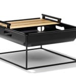 Simply lift the top of the table to raise it. The table has two open compartments for storage and hidden storage space under the tabletop. You can use it as a dinner tray or a makeshift workstation for you laptop. The handcrafted table is made of solid mango wood and available in different colors, as ebony, grey, natural and umber brown. There is also the Square Lift Top Coffee Table with two separate table tops.